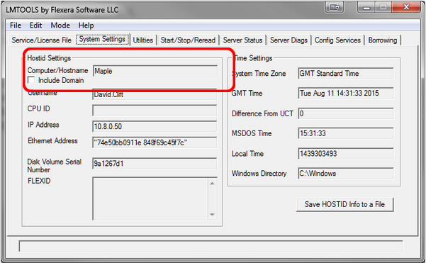 Note: If you are not sure of the name of the machine you are using click on the System Settings tab of lmtools, where it is shown, see below: