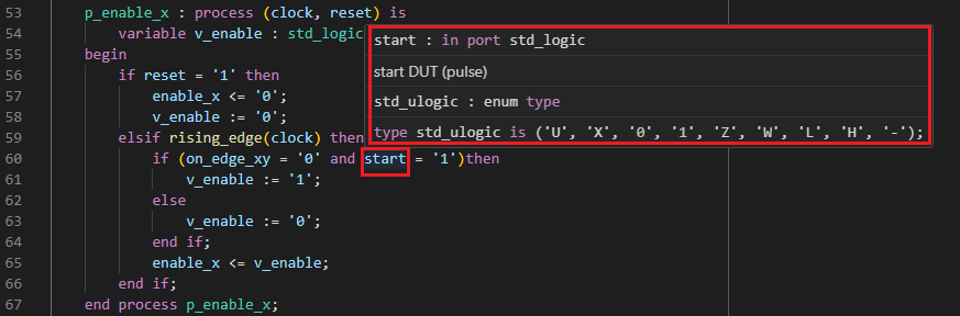 To learn more about the declaration of a given identifier, you can hold your mouse over it. After a short time, a pop-up will show you the name and data type of the signal. This technique is called hovering.