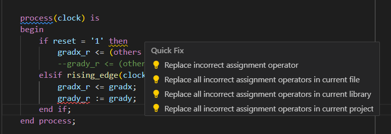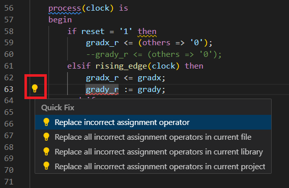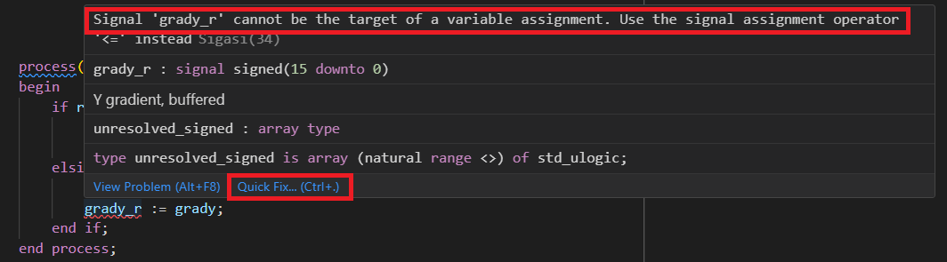 Problems that have markers can be resolved automatically through a Quick Fix. To see whether a Quick Fix is available, hover over a problem underline.