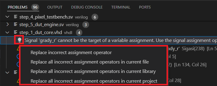 Finally, you can also trigger Quick Fixes from the Problems View by hovering over a problem and clicking the lightbulb icon that appears.