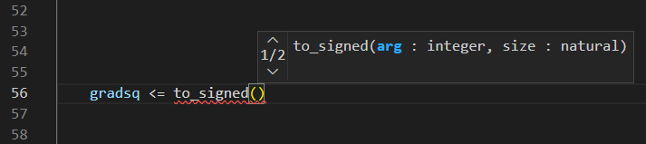 When you invoke a function in VHDL or Verilog, Sigasi will list that function’s arguments in a pop-up window that will appear once you type an open parenthesis.
