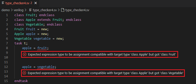 In Verilog and SystemVerilog there are dozens of places where an expression or identifier of a specific type is required, e.g., operators have expectations on operand types, there are limitations on what a class can extend or implement, etc. It may not be obvious at first glance if a variable or net type complies with these requirements. Such non-compliances will be detected and marked by Sigasi (rules 78, 79, 100, and 131).