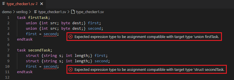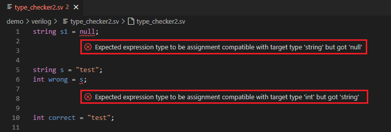 These are but a few examples. Sigasi checks numerous other expression expectations in different contexts in SystemVerilog, immediately showing incorrect types and variables usages.
