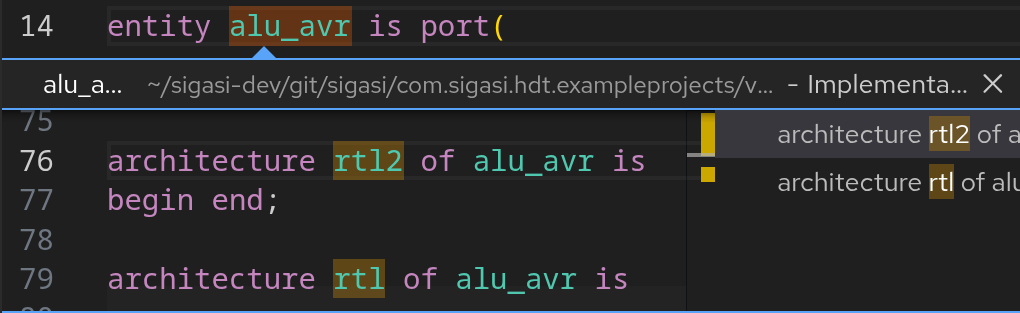 Navigating between these is often done through text searches that also find false positives. Sigasi understands your entire design, so you can simply hover over the name of a definition and click Find All Implementations. To go from an implementation back to the definition, use Go to definition.