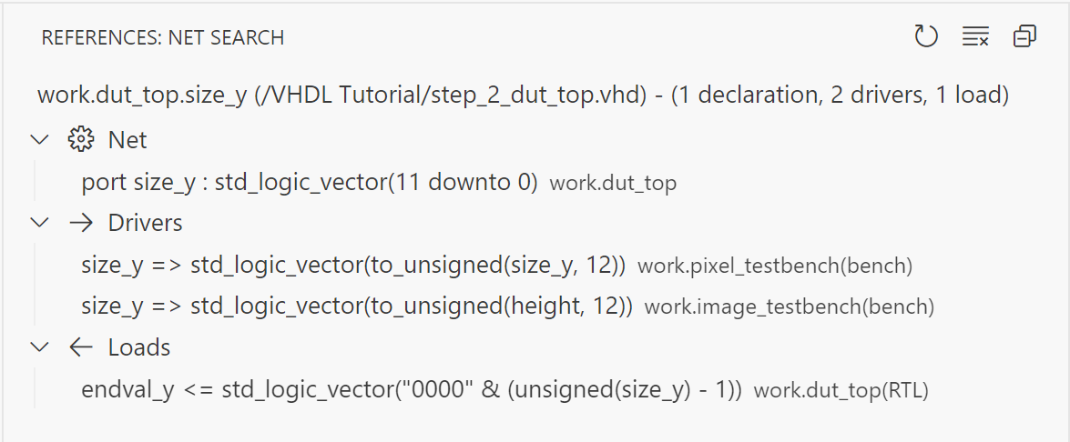 With Net Search, you can find a net’s loads and drivers. A net is defined as a signal or port and all other signals and ports that are directly connected to it. The loads are where you read the value of a net, and the drivers are where you write to it.