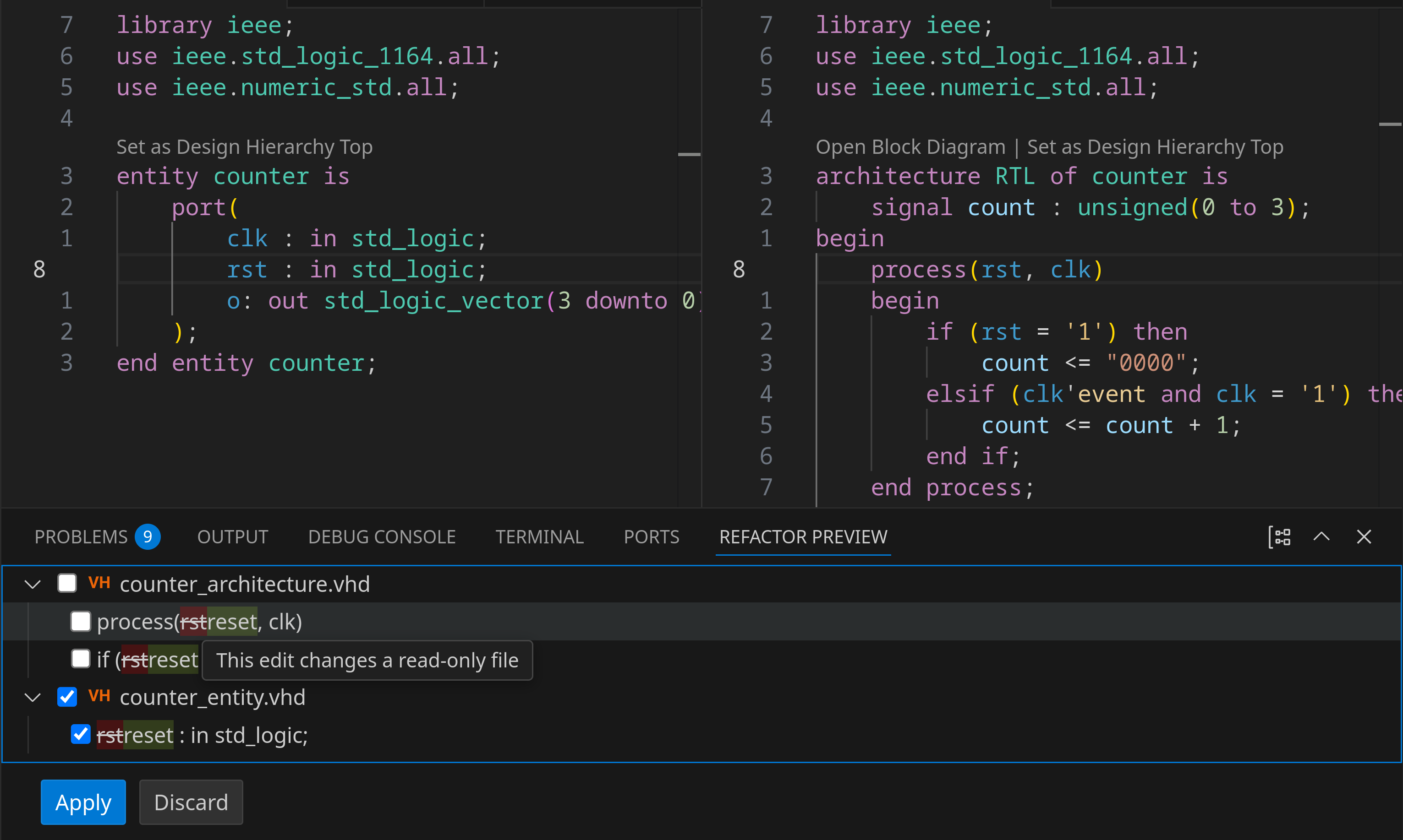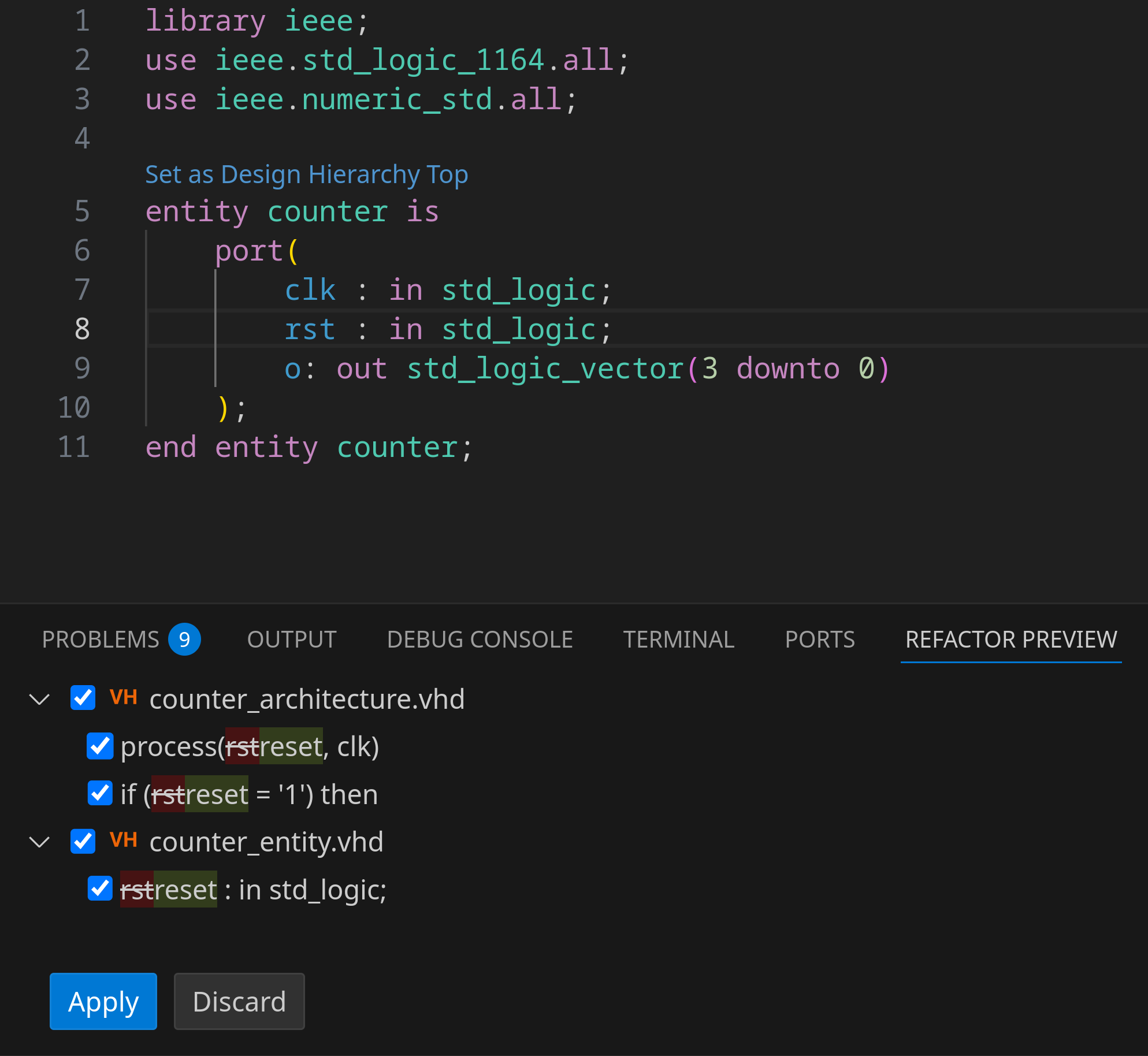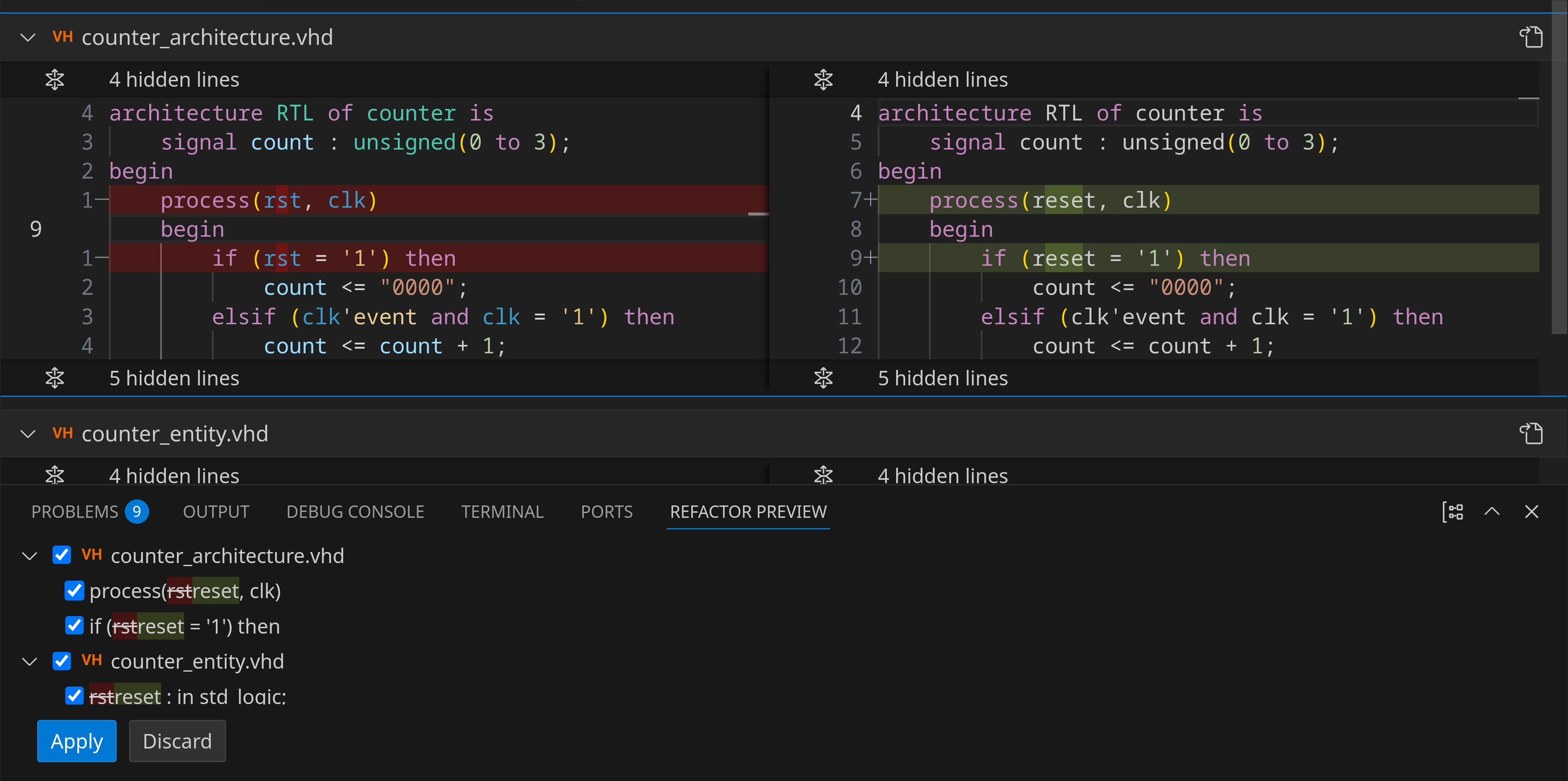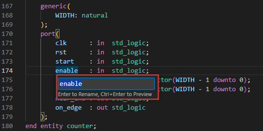 Right-click on any identifier (VHDL or SystemVerilog) and select Rename Symbol to change the name of the associated declaration and all its references. Once you select Rename Symbol a little dialog box will pop up.