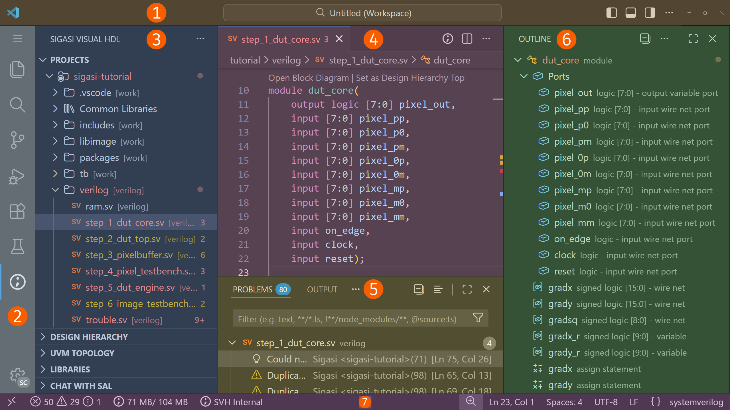 - Status Bar: The bottommost bar. It shows the status of VS Code, Sigasi, and of other extensions.