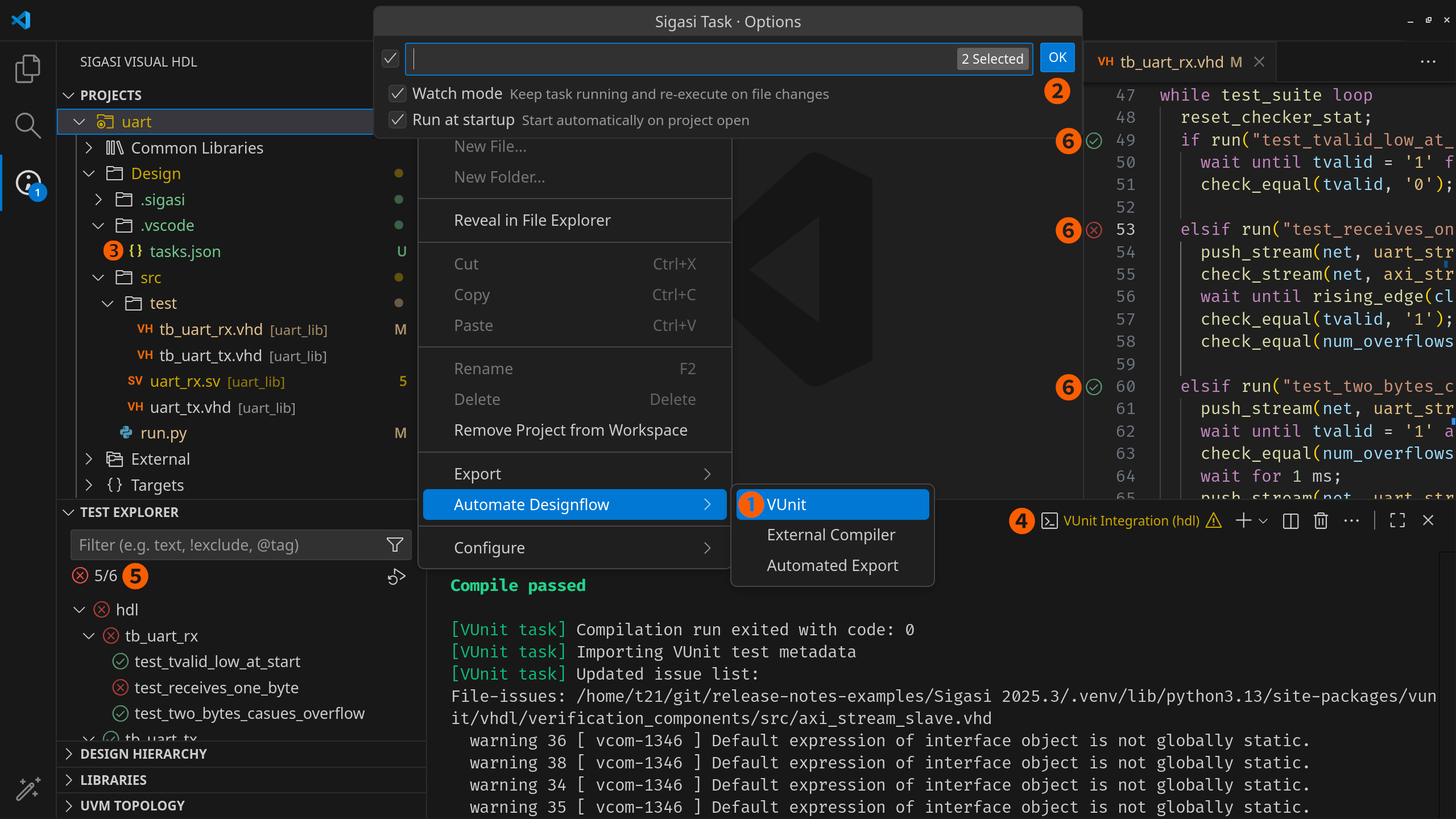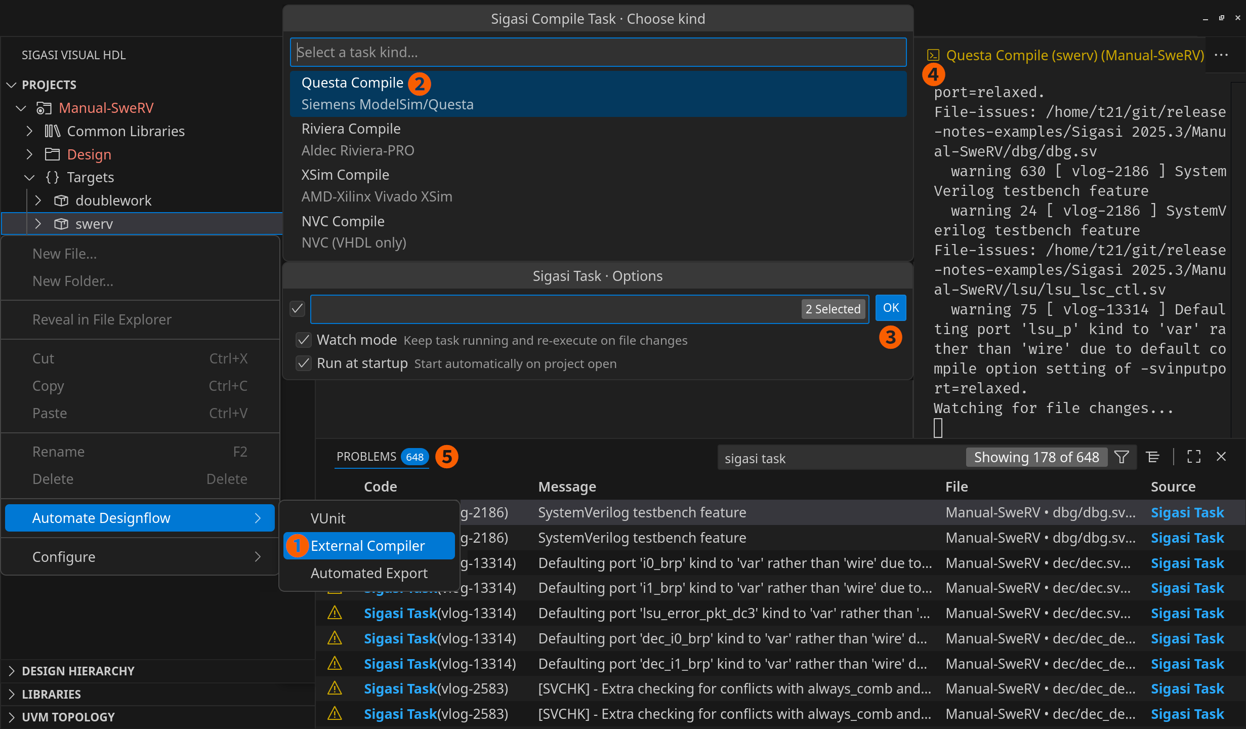 Design flow automation minimizes context switching, optimizing your workflow and saving time. It allows you to automatically run external compilers—such as Questa or Riviera—whenever design files are changed. If you are using VUnit, you can smoothly automate the compilation of your testbench and the population of VS Code’s test view. Finally, you can automatically export the compilation recipe to keep your downstream tools in sync with the changes made in Sigasi.