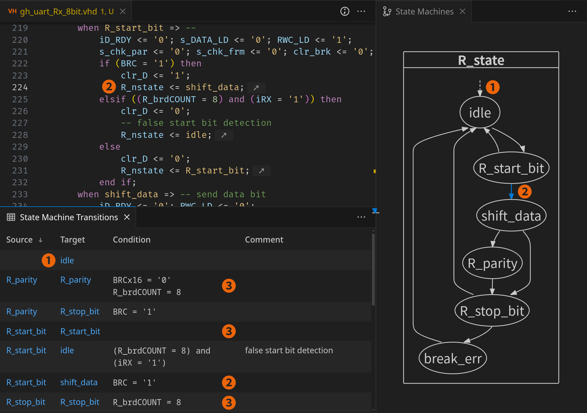 - Every transition is shown in the table. Clicking it highlights the transition in the diagram. Double-clicking highlights it in the code.