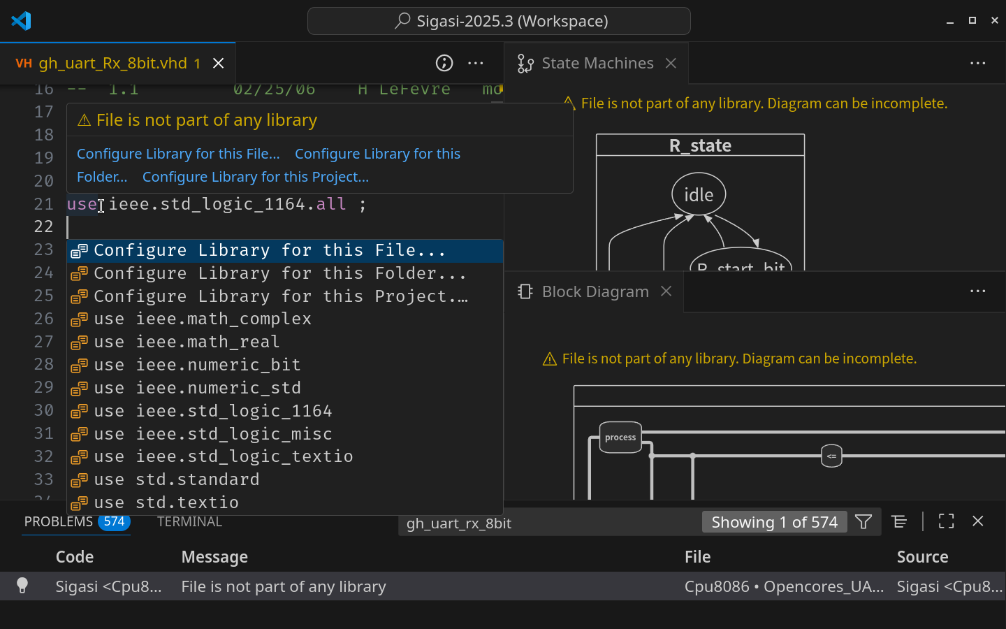 A project is made up of files that are mapped to libraries. To unlock Sigasi’s full potential, you have to ensure that your library mapping is set up correctly. That is why we added many hints to guide you during your project setup.