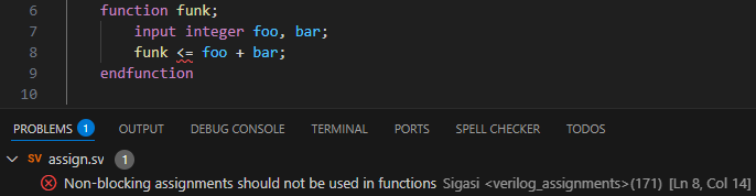 As Sigasi’s code linting rules checks for non-blocking assignments in functions, you don’t have to worry about them anymore. In the example below, Visual HDL flags an error for a non-blocking assignment in a function.